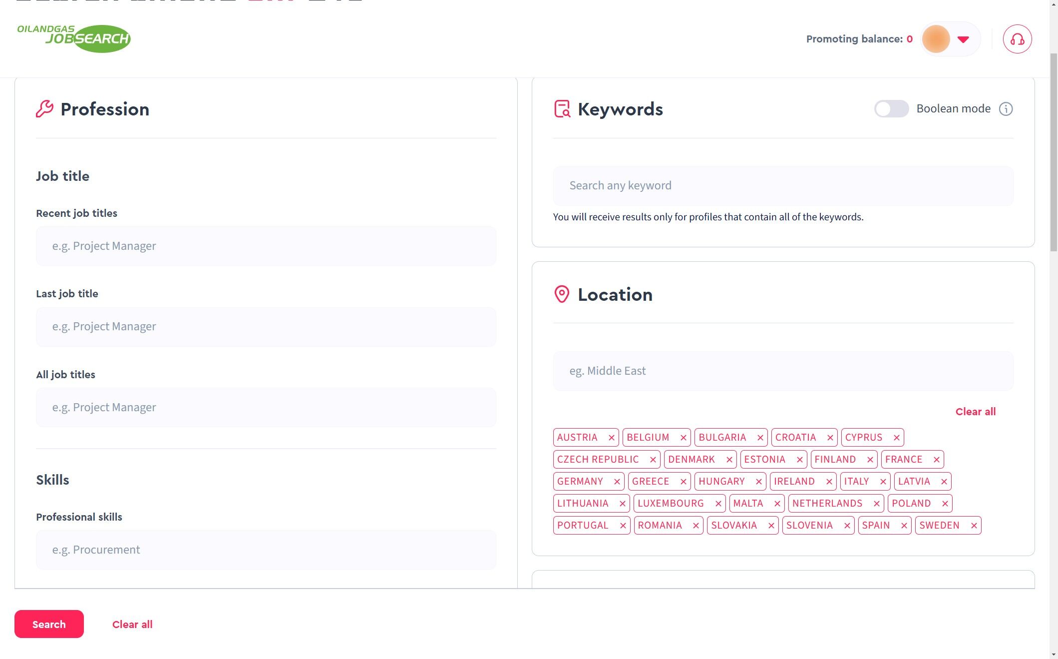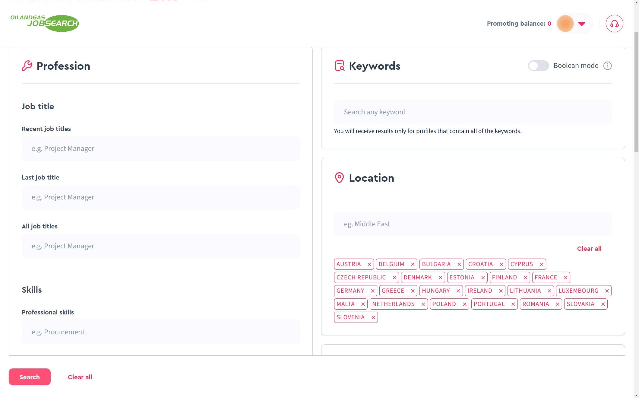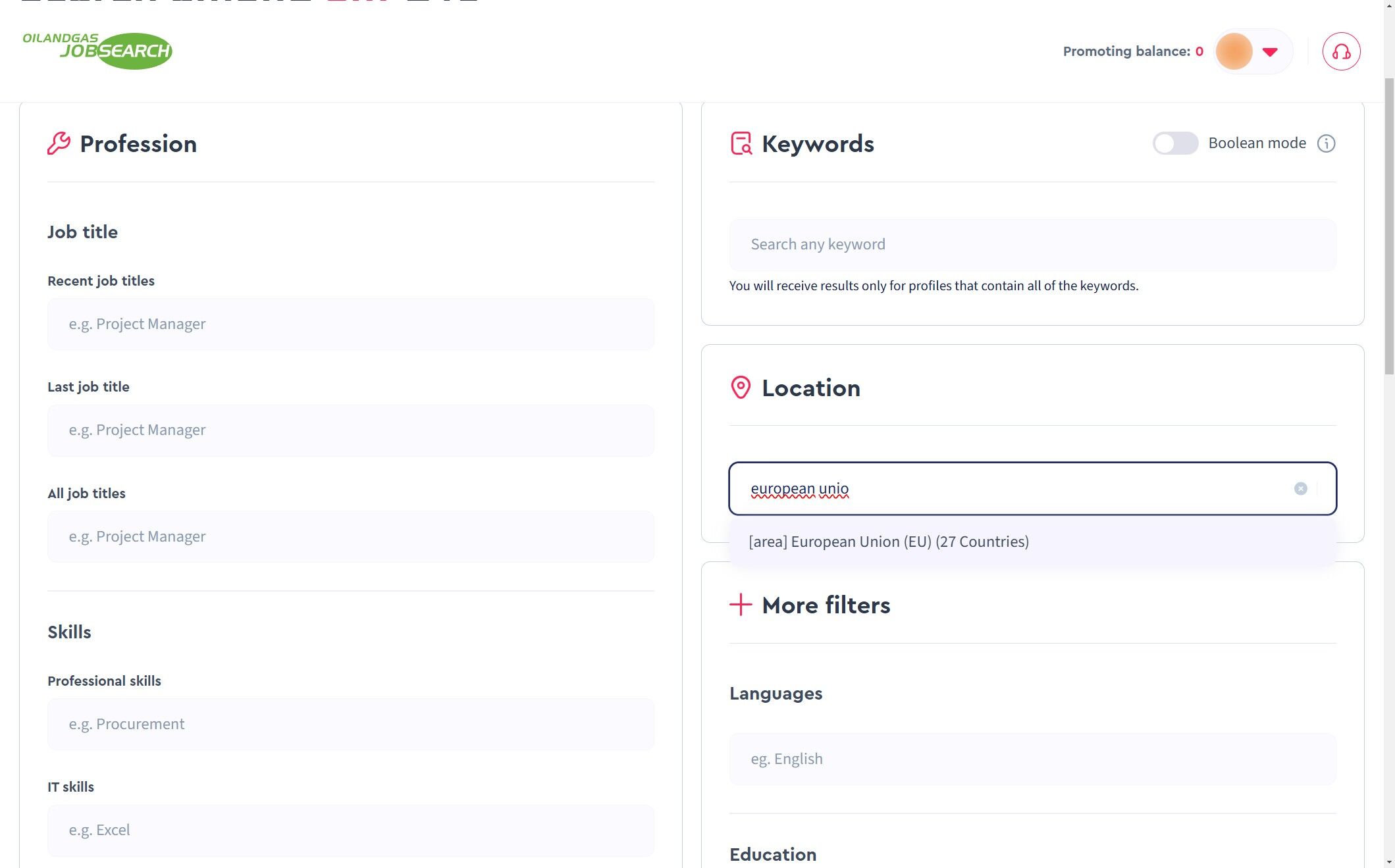 You may utilise the "Location" filter for searching candidates by city range, country or even by a larger group of countries such as Middle East, EU and others