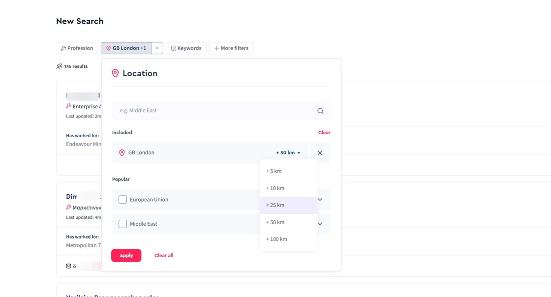 See below how to search for candidates within a specific range of a city.