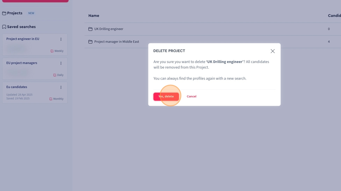 Candidates listed under the the deleted project will automatically be removed from the project.